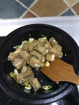 热锅,放少量油,切好姜蒜放入炸香,把排骨放入锅中,翻炒一小会儿,把事先调好的酱汁倒进去,翻炒。
