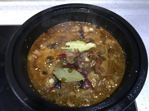 将之前腌制肉的糖醋汁倒入锅中并加入香叶八角冰糖等炖料小火慢炖15~20min,别忘了放小尖椒提点辣味~不然会太甜。