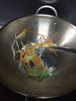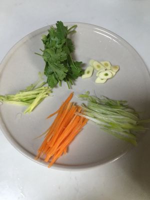 趁现在把淀粉用水拌一下差不多和融化的冰淇淋一样就可以了,接着调汁料酒一勺,老抽两滴,白糖三勺,醋四勺,清水五勺我都是按这个比例调的如果嫌味道不够可以自己再加些,调好的汁里面放少许淀粉,把葱,姜切丝,香菜切段备用
