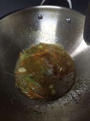 调好的汤汁倒入其中 等粘稠后将肉倒进去炒几下