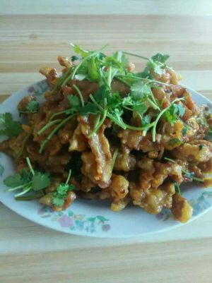 锅中放油烧热倒入调好的汁放入姜丝葱丝,炸好的肉倒入锅中翻炒一下让肉上裹上汁,再放入香菜就可以出锅了