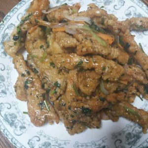 少许油热后放入炸好的肉,放葱姜蒜末,放入料汁翻炒出锅。