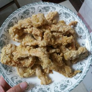 热油烧至五六成时,肉片一片一片下锅炸至金黄捞出,全部炸完后再入锅重新炸一边,这样才会外焦里嫩!