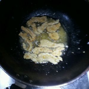 炒锅中倒入植物油加热至六七成,放入裹上粉浆的肉片;