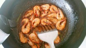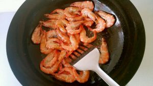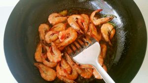 炒至虾变色,用铲刀压住虾头煎出虾油,盛出