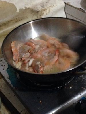 起锅上有油 先放大虾 使劲煎炸 可以按下虾头容易出油 把虾油都炸出来 放入葱姜蒜翻炒