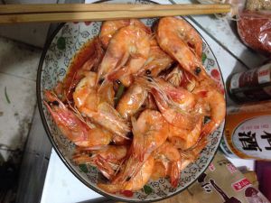 锅热后放入适量油,油要稍微多一点,放入桂皮和大料,煸香后放入虾,虾要摊平,待一面儿变色后翻面,翻面后用铲子挤压虾头,挤出红油,放入葱丝,姜丝,盐,白糖,料酒,翻炒均匀再放一点水,焖30秒钟,出锅。