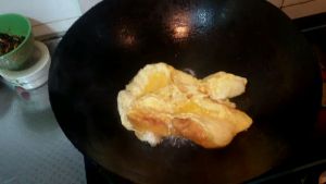 油锅烧开,搅拌好的鸡蛋下锅,炒熟。