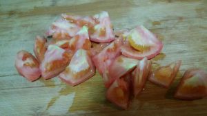 西红柿洗净,切成块。