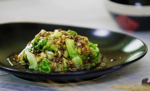 处理好的生菜控干水分,摆在盘子里。如果不想摄入太多热量,到这步可以直接浇生抽和橄榄油在上面,拌一拌就可以吃了。