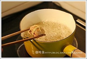 国内热少量的油,放入蒜姜末和五香粉炒香,倒入少量的水,水开后加入化好的淀粉勾芡。再依次放入一丁点的胡椒粉,花椒粉,生抽。一丁点喔~有点底味就可以。