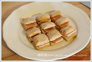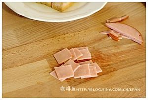 将臭豆腐在侧面切开,但不完全切透,夹上两片火腿;