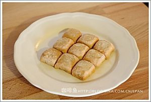 油热后豆腐下锅,炸5分钟左右,色焦黄取出,牙签扎几个孔,把之前做好的蘸料倒在豆腐上,拌匀即可