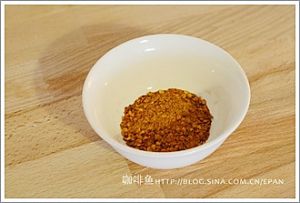 用适量辣椒粉、花椒粉、盐、味精调成蘸水。