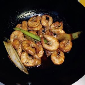 然后将虾倒进锅中,淋料酒,耗油,食盐适量,放入葱段,盖锅盖闷1—2分钟即可。