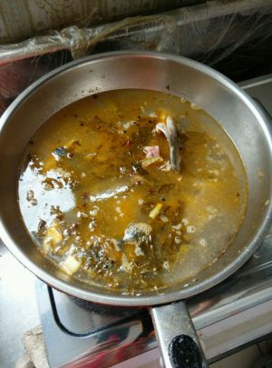 锅里少许油加花椒姜片葱段煸炒香味。放入酸菜,煸炒香味,放入鱼头鱼骨,煸炒,倒入开水,煮开,炖十分钟!