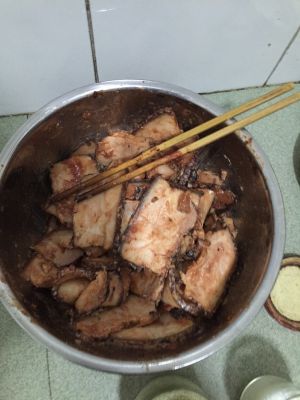 将老抽少许、生抽适量、糖一勺调成汁,涂抹在煮好的五花肉上。剩下的汁直接倒入碗中浸泡五花肉,放置20分钟左右