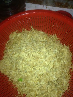 7. 把梅干菜的汤汁收净后拣出葱姜、八角、桂皮不要。