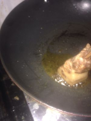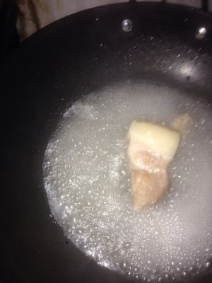 锅内放入少许油,烧至五成热,将五花肉放入炸成金黄色,炸制过程不能超过五分钟