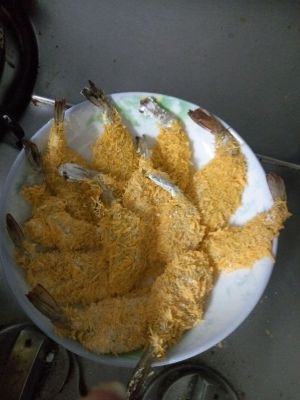 把裹上蛋液的虾球放入面包糠中裹匀。