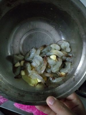 虾壳只留虾尾,放入姜蒜盐,料酒。