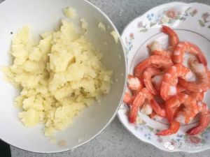 虾去头、去虾线,将腿和壳剥下(留最后一节和尾巴),用盐和料酒腌制15分钟;将蒸好的土豆撵成土豆泥(越细腻越好),放入适量的盐和胡椒粉拌均匀