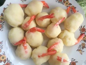 将土豆圆球按扁,放一只虾肉在土豆泥上,虾尾在外面