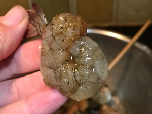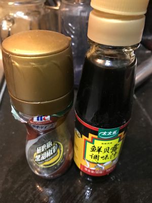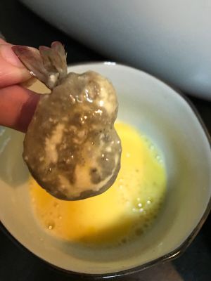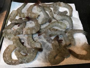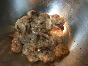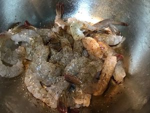 把虾皮去掉,用牙签挑出虾肠,用黑胡椒和盐腌15分钟