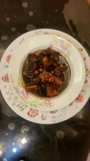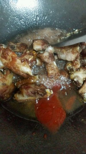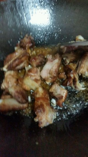 把排骨挑出来单独放在一个碟子里【汁要留着有用】热锅 倒油然后把排骨放进锅里放盐放糖放醋【个人偏甜】翻炒 然后把汁倒入锅里煮,如果骨头大的话就多煮一会,