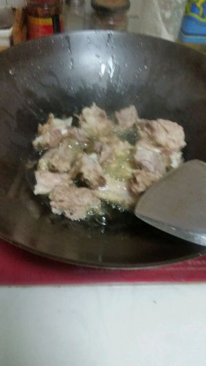 热锅,下油。待油温7成熟下排骨,记住下去不要急着翻他,待他收下水再用铲子推开。