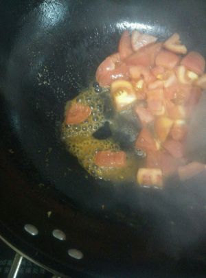 再往锅里倒油,不用太多油,锅热了放西红柿去炒,3分钟左右出汁,火要大,