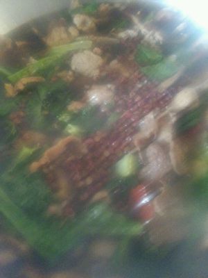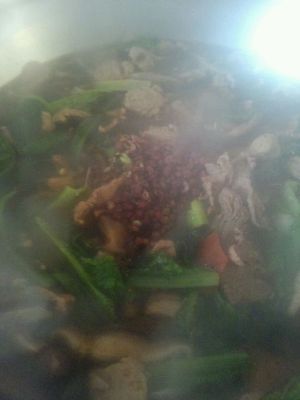添加水放入盐,孜然,辣椒粉,味精,鸡精,准备的蘑菇,还有肉片,煮十分钟左右。再加入油麦菜,油麦菜放入后就可以出锅了进入下一步了