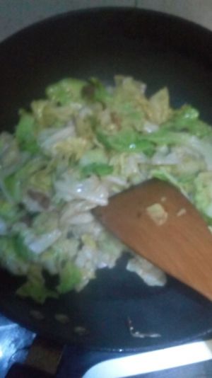 放入白菜炒熟,加入盐糖鸡精。关火前加入醋即可