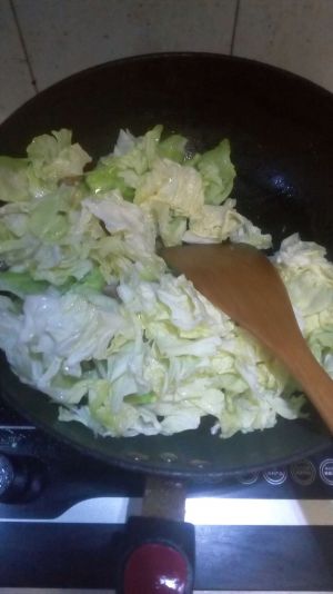 把包菜放进去快速翻炒,不断翻炒炒至回软