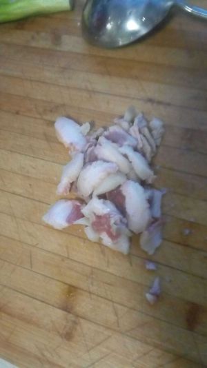 将食材洗净后,包菜撕成小片、腊肉切块、蒜苗切段、葱切粒、姜切片备用。