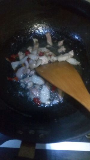 炒出猪油后,放入姜片、花椒颗、辣椒节炒香。