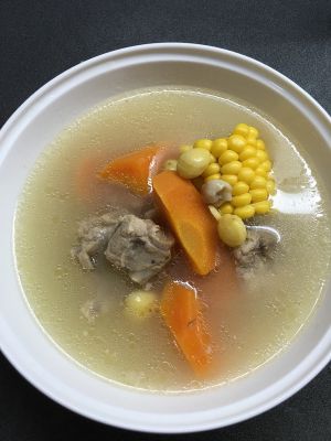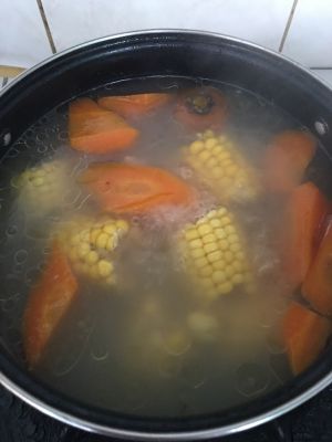 放排骨,放开水 滴两滴醋。炖半小时再放玉米胡罗卜。炖上一小时放盐鸡精美汤完成。