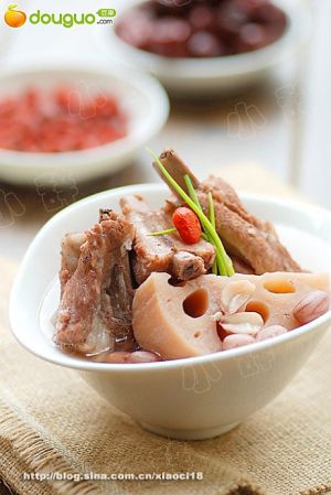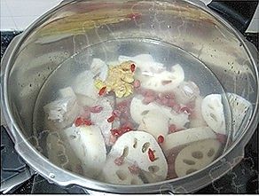 莲藕刮去表皮,洗净后切段,与焯好的排骨,老姜,花生,枸杞一起加足够热水,放入高压锅内。