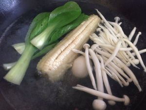 锅里加清水,把玉米、鸡蛋、菌类及青菜按先后顺序煮熟。