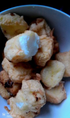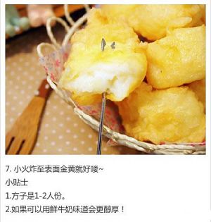 把鲜奶冻块放进去挂上面粉糊,放油锅炸就好了。很好吃
