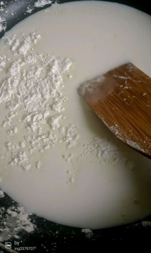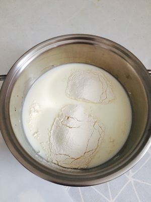 把牛奶,淀粉,面粉倒入奶锅中,搅拌均匀