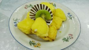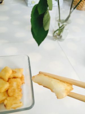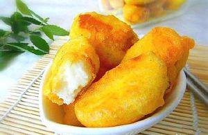 凝固好的牛奶蘸上面粉糊,放到油锅里炸至金黄。美味的炸鲜奶就完成了