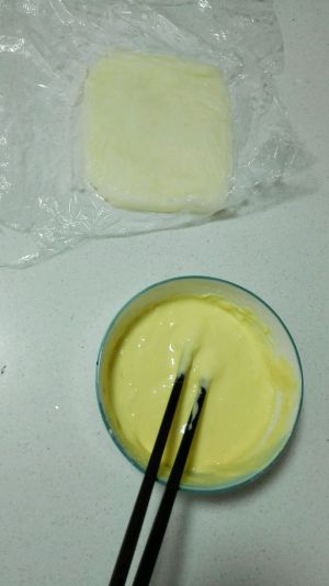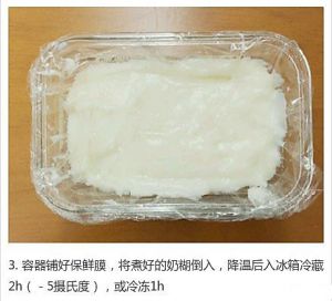 2、在容器内铺层保鲜膜便于倒出,倒入奶糊,冷藏一小时。 (PS:放入冷冻的话,时间更短。面糊不能太软也不能太硬,俺这奶糊模样就是反面教材哈!可能是用舒化奶的原因,奶糊也随着泛黄,若是白色更养眼喔~)