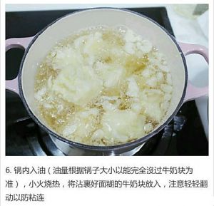 锅内入油(油量根据锅子大小以能完全没过牛奶为准),小火烧热,将沾裹好面糊的牛奶块放入,注意轻轻翻动以防粘连。