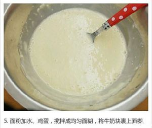 面粉加水、鸡蛋,搅拌成均匀面糊,将牛奶块裹上面糊