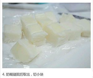 首先把牛奶和淀粉,糖,放锅里加热,不断搅拌,成粘稠的浆糊状,稍微冷后放冰箱冷冻,我都是用浅点的饭盒垫上保鲜膜,这样冻了容易取出来,忘了拍照片了
