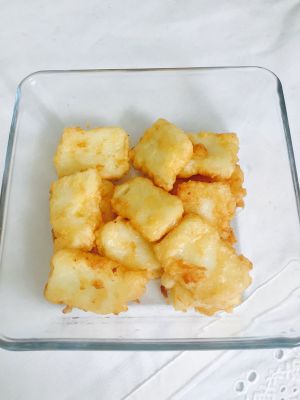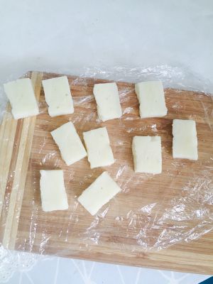 4、取出切块,锅中烧油,奶块裹上一层面糊。