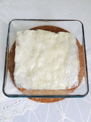 容器铺好保鲜膜,将煮好的奶糊倒入,降温后放入冰箱冷藏2h(-5摄氏度),或冷冻1h