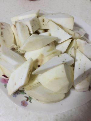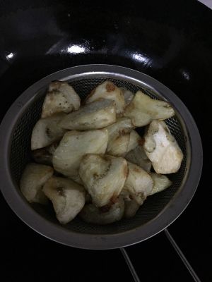 炸锅里放宽油,先热锅,后放油。油八成热时候,放入依次沾上水淀粉的茄子块炸至金黄色,捞出备用。
