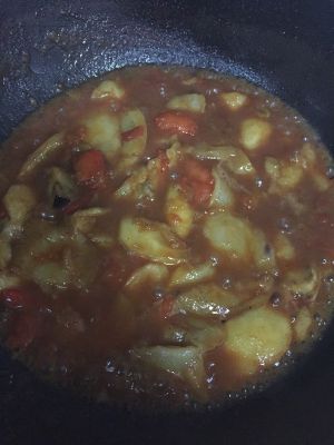 放完酱油后大概这个颜色就可以了。然后中火转成大火,放小半碗水,开锅后放入白糖和盐。